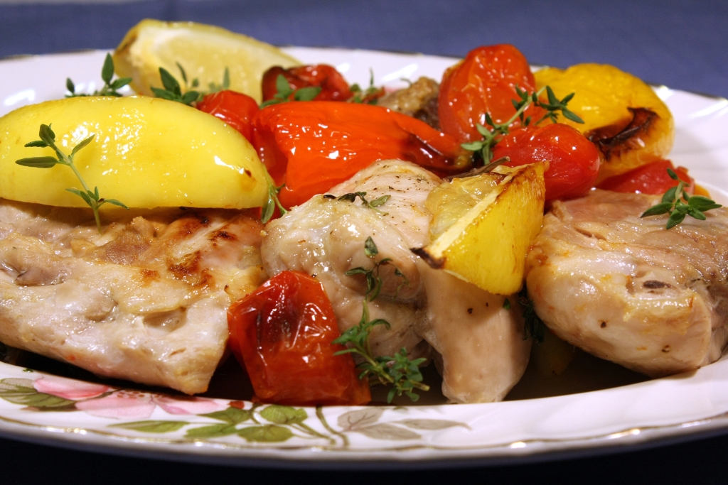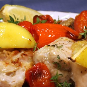 Season the chicken generously with salt and pepper. Place in a roasting pan with the tomatoes, lemon and peppers, Sprinkle over about a dozen sprigs of thyme and then drizzle with about 1 tablespoon of olive oil. Bake in a 180 C oven for around 30 minutes, or until chicken is tender and lemons have nicely caramelised on the outside. Place on a large platter and scatter over a few more sprigs of thyme. Serve with a green salad and cous cous with herbs and green chilli.