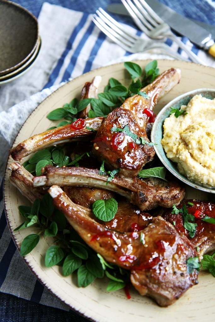 Today we departed from our usual Anzac Day tradition of making and eating Anzac biscuits in favour of these most delicious lamb cutlets with cumin and home made sweet chilli sauce. Having been up and about quite early for my youngest who was marching in the local Anzac Day service, we were ready for a hearty lunch. The combination of great quality meat, and some of lamb’s best buddies – cumin, chilli, hummus and loads of fresh herbs, makes this recipe a delight to prepare and eat. The secret is to have the pan or grill really hot and to cook the lamb for only a couple of minutes each side, brushing on the sweet chilli sauce in the last minute of cooking and then liberally sprinkling with fresh herbs. I used home made sweet chilli sauce, because we have been inundated with chillis in the vegetable garden, but good quality store-bought sauce will also give an excellent result.