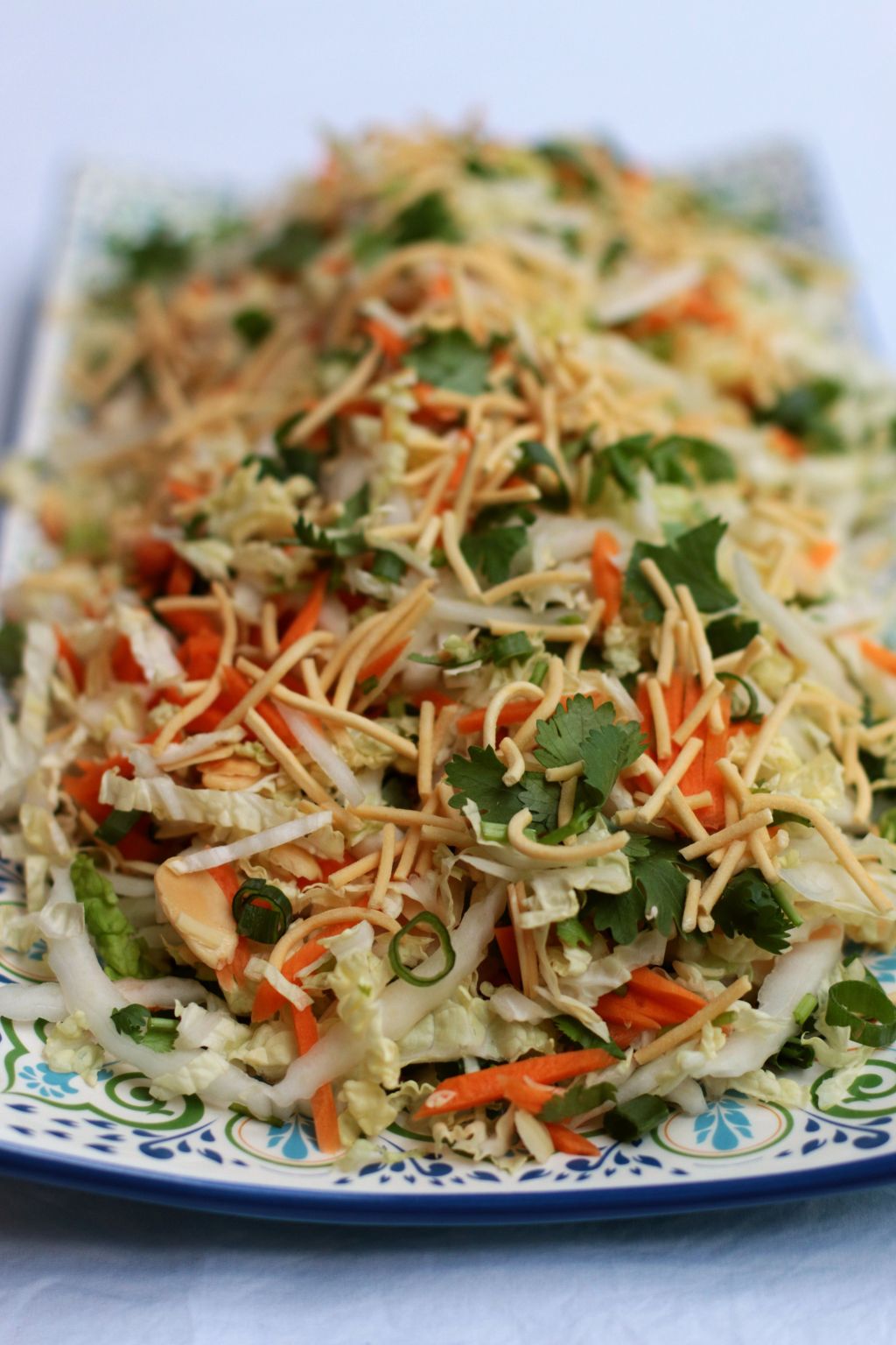 And so to Mrs Chang’s salad. I wanted to add some freshness and a little more colour to the traditional recipe. It has always seemed a little pale and flat looking to me so I added finely shredded carrot and lots of bright, earthy coriander. The dressing is so delicious, but I wanted a little more punch, so I added freshly grated ginger, a squeeze of fresh lime, and the smooth sweetness of honey. You can decide if you want to keep the shallots, I find them a bit acrid, and they leave a weird taste in my mouth, similar to the aftertaste of raw onion. So when I make it I leave them out. It’s important to not dress the salad until right before serving – the crunch of the almonds and noodles will disappear fairly quickly. If you want to make it ahead, then add the noodles and almonds at the last minute and then add the dressing. Have fun with it and make your own changes to suit your tastes.